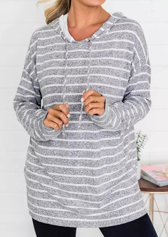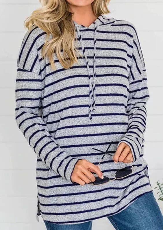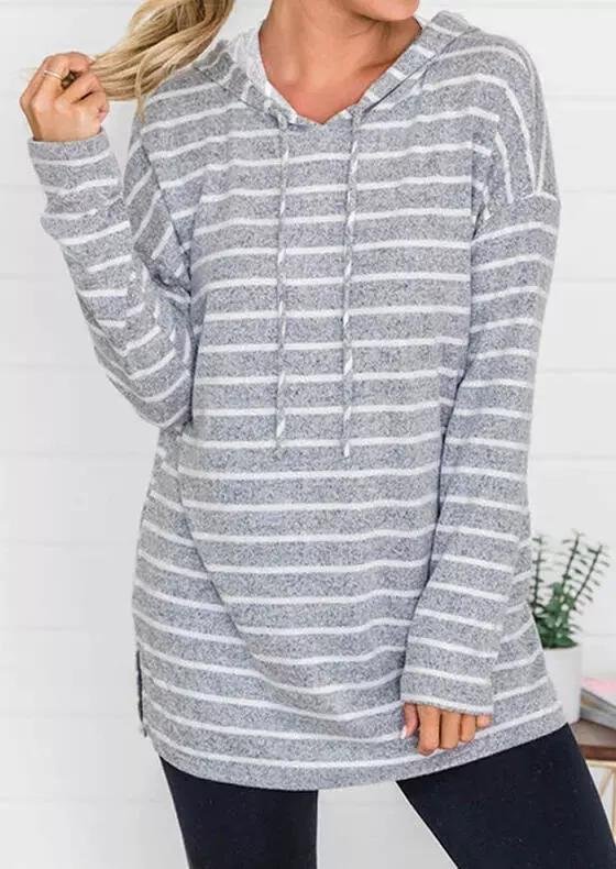 HomeHoodies & Sweatshirts Striped Drawstring Slit Loose Hoodie – Light Grey